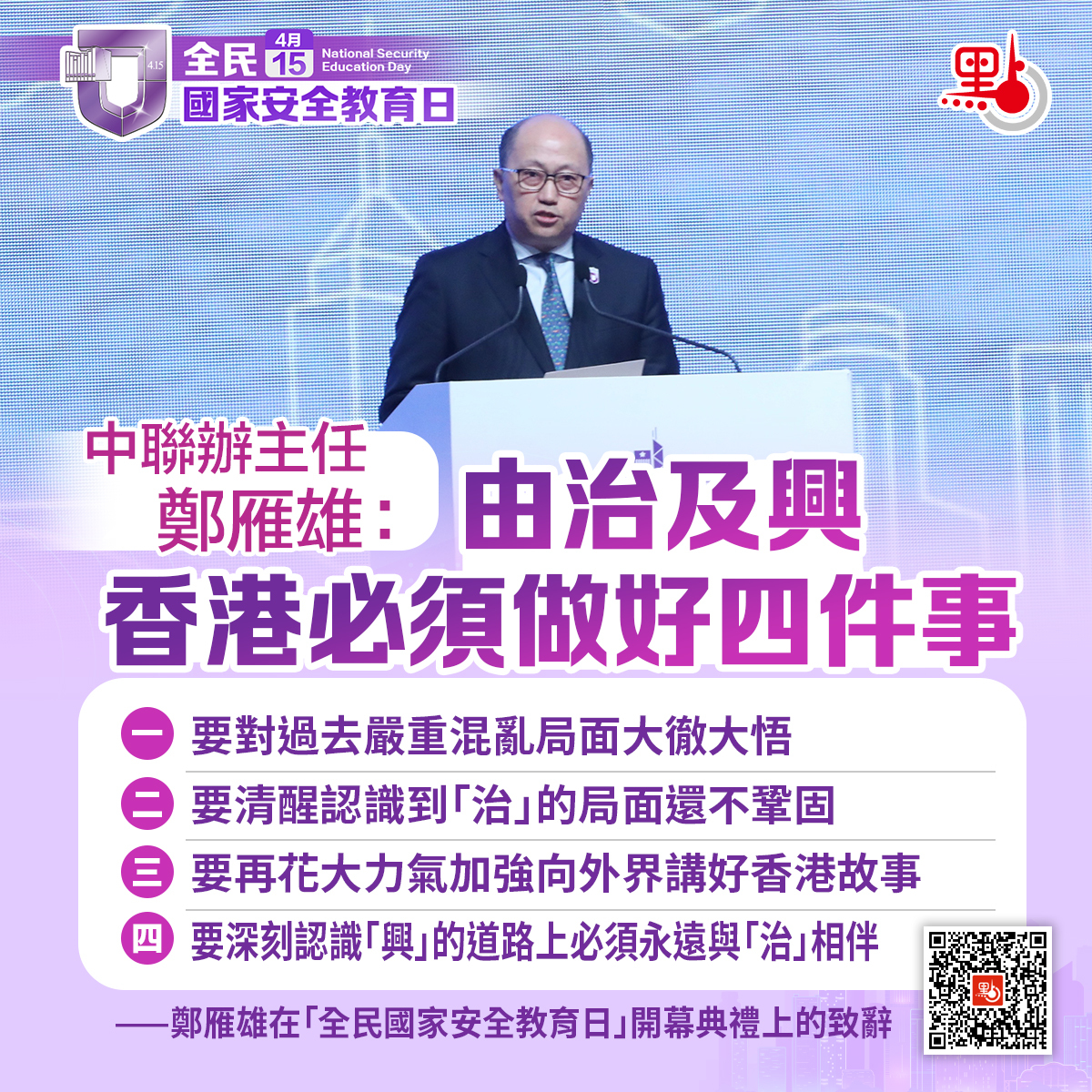 今日(15日)是香港國安法實施後第三個「全民國家安全教育日」。「全民國家安全教育日」開幕典禮暨主題講座今日上午在香港會展中心舉行,香港中聯辦主任鄭雁雄出席並致辭。鄭雁雄表示,在新階段關鍵期,既增強「興」的緊迫性,又不忘「治」的重要性,處理好這樣的辯證關係,必須做好四件事情。