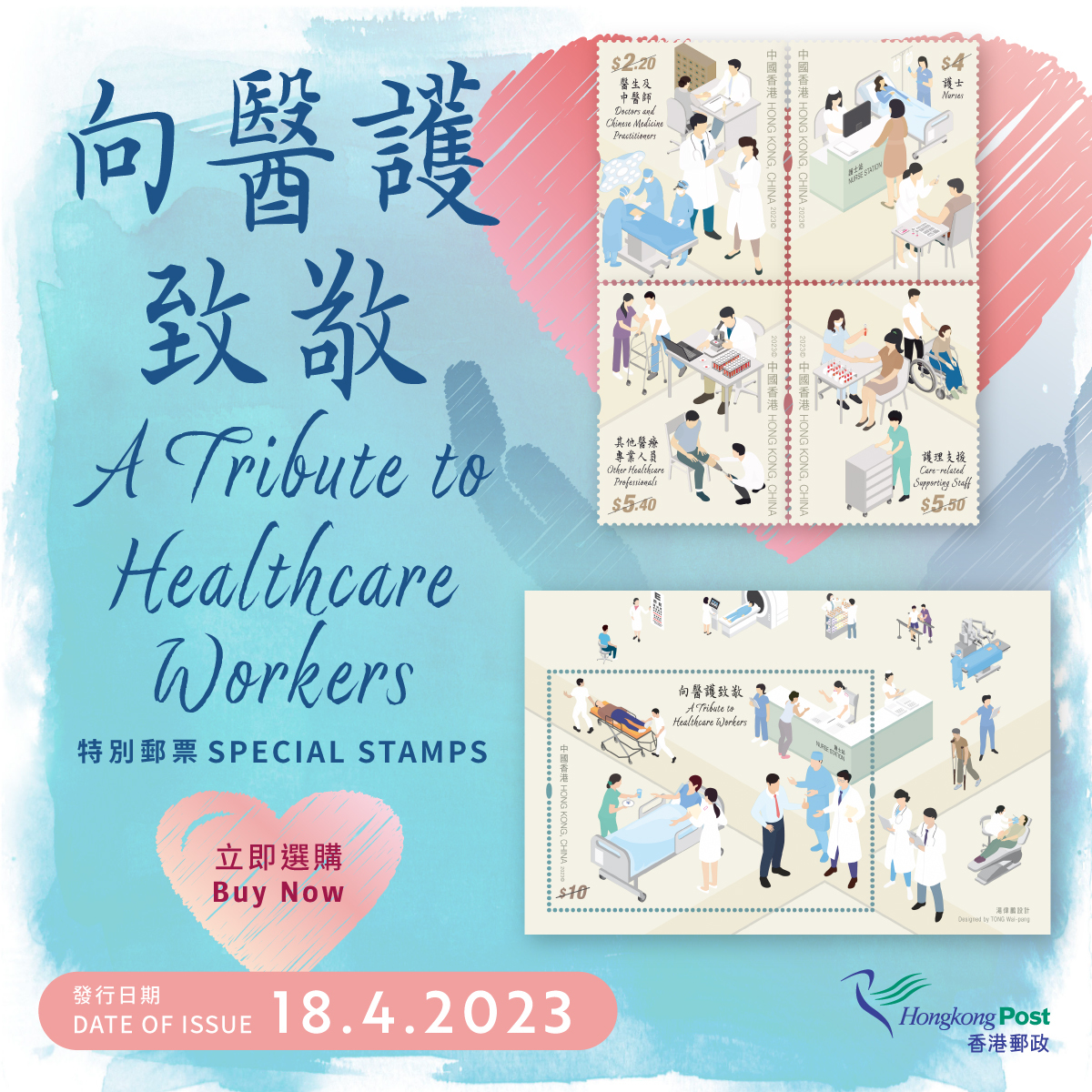 這次發行的郵品展示一眾與市民並肩作戰的醫護人員,包括醫生、中醫師、護士、其他醫療專業人員及護理支援人員,他們不辭勞苦地工作,盡心竭力為守護香港及保障市民的健康作出貢獻,充分彰顯醫護人員專業無私的精神。