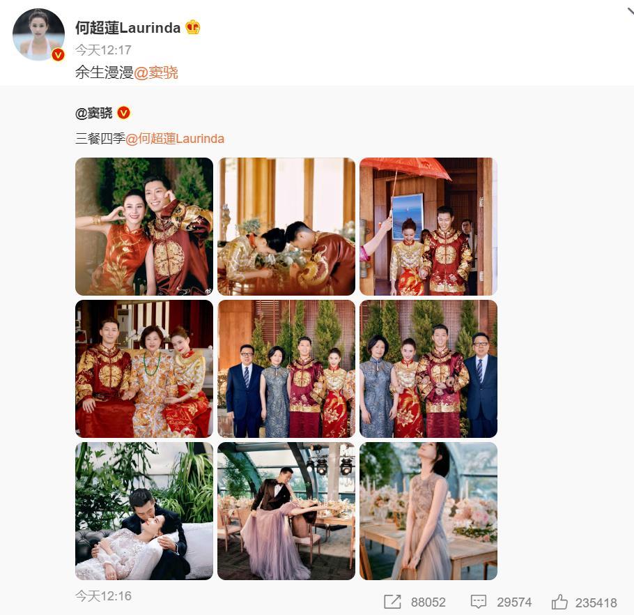 賭王千金何超蓮與竇驍今日(18日)大婚,一對新人於社交網以詩句「三餐四季」、「餘生漫漫」傳情。
