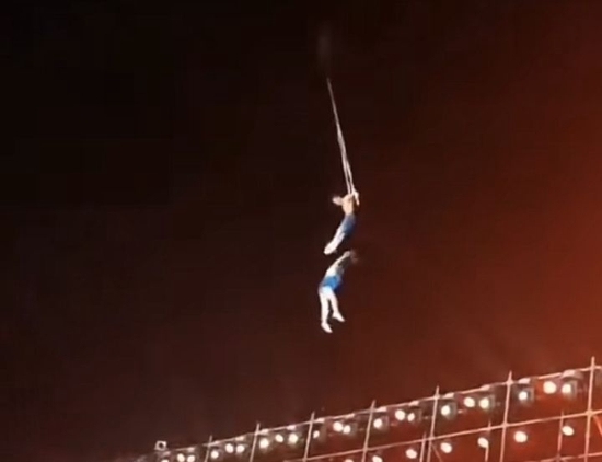 點新聞早前報道,4月15日晚,安徽省宿州市埇橋區蒿溝鎮一場雜技表演現場,一位女演員因失誤從高空墜落重重摔在地上,令人揪心。多段網絡視頻顯示,一個戶外演出的現場上,表演高空雜技的男女兩名演員抓住吊環,被起重機吊到空中。升空的過程中,女演員突然從空中墜落至舞台上,現場觀眾發出陣陣驚呼聲。