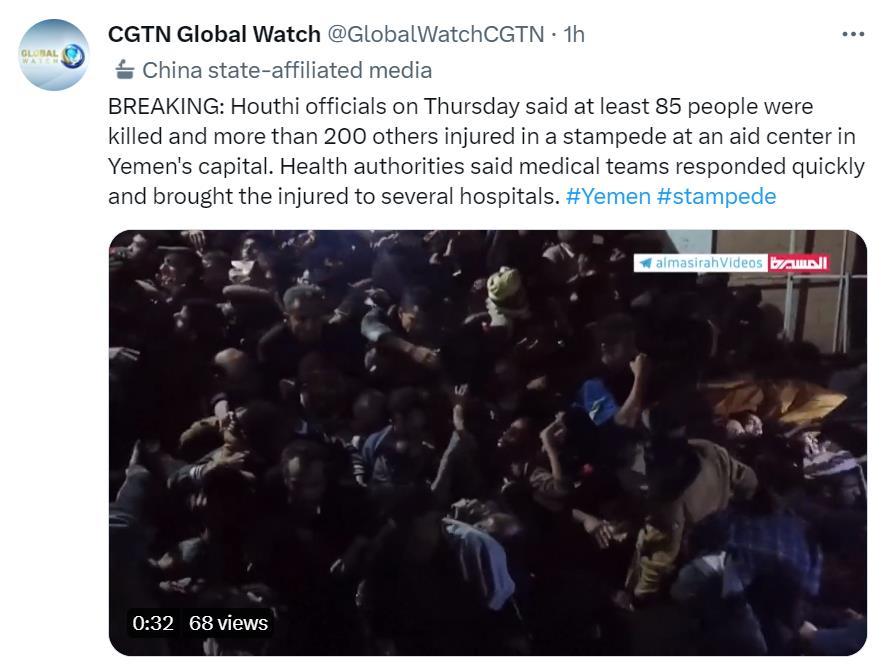 也門首都薩那一個慈善物資發放站,當地時間星期三晚發生人踩人事故,最少85人死亡,超過200人受傷。網傳視頻顯示,現場一片混亂,數十人緊緊擠在一起,無法動彈,大聲呼救。