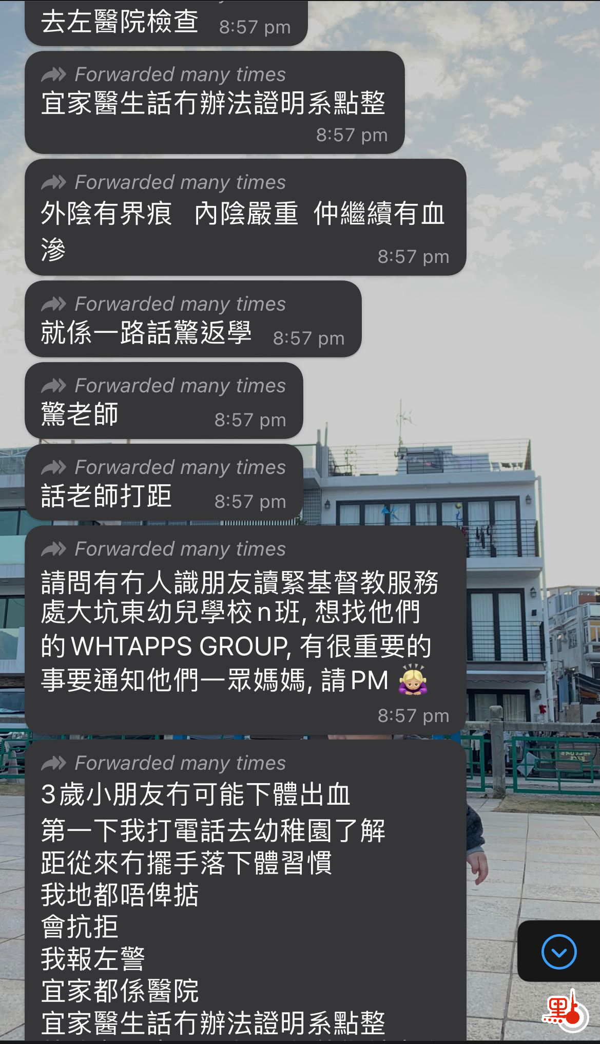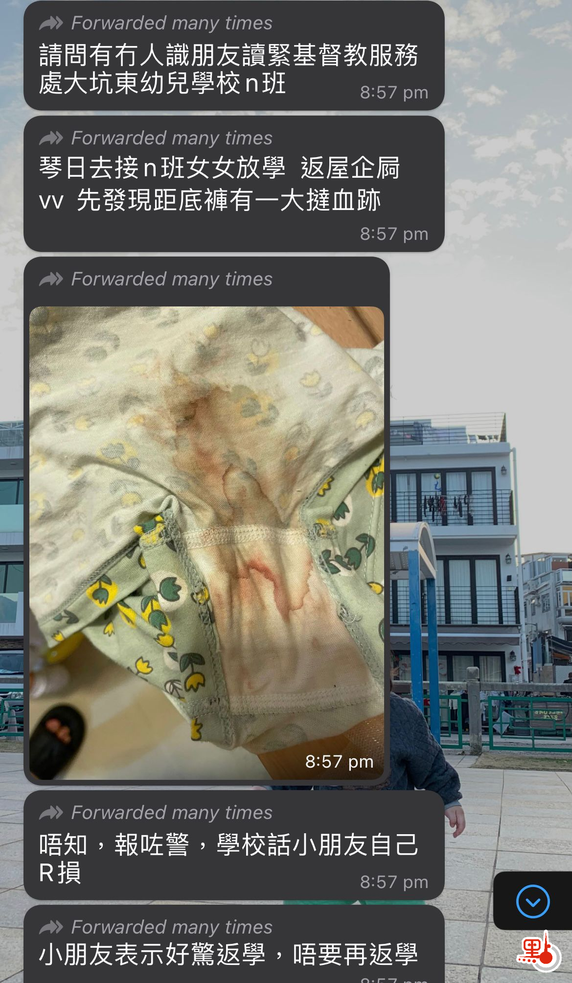 深水埗一所幼兒園懷疑發生虐兒事件。據傳媒今日(21日)接獲爆料報道(點新聞亦接獲相關投訴),指早前發現其3歲女兒放學後,發現其貼身內褲上有血跡,並且在下體外圍發現有可疑𠝹痕。又指出女兒懷疑早前在校內被老師「打心口」而一直抗拒返學。有傳媒向涉事的大坑東幼兒學校查詢事件,相關辦學團體表示高度關注事件,學校以兒童安全為首位,稍後將會進一步交代事件。