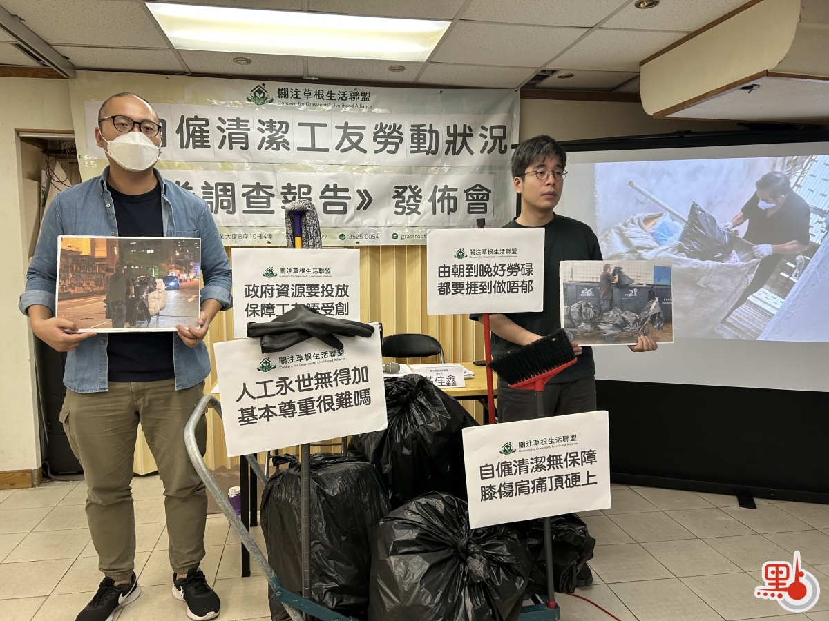 「關注草根生活聯盟」(關草聯)在2023年3至4月間訪問了30位在旺角及大角咀從事大廈清潔、倒樓和運送餐廳垃圾的自僱清潔工友,了解他們的勞動狀況及職業安全健康情況。五一勞動節將至,關草聯今天(22日)發布《自僱清潔工友勞動狀況問卷調查報告》,反映工友面對的處境及困難。