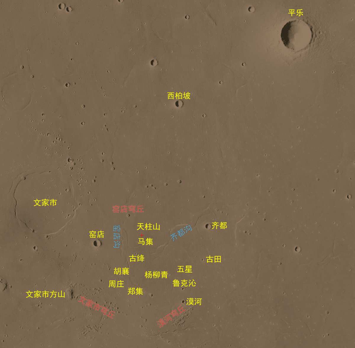 科學研究團隊通過火星高分影像,識別了着陸點附近大量的地理實體,國際天文聯合會根據相關規則,將其中的22個地理實體,以中國人口數小於10萬的歷史文化名村名鎮加以命名。將中國標識永久刻印在火星大地。