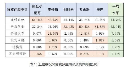 報告提出,直播帶貨消費維權輿情主要反映了7方面問題,其中,涉及產品質量問題的佔45.75%,虛假宣傳的佔37.82%,不文明帶貨的佔5.19%,價格誤導的佔5.08%,發貨問題的佔4.46%,退換貨的佔1.45%,銷售違禁商品的佔0.14%,誘導場外交易的佔0.11%。