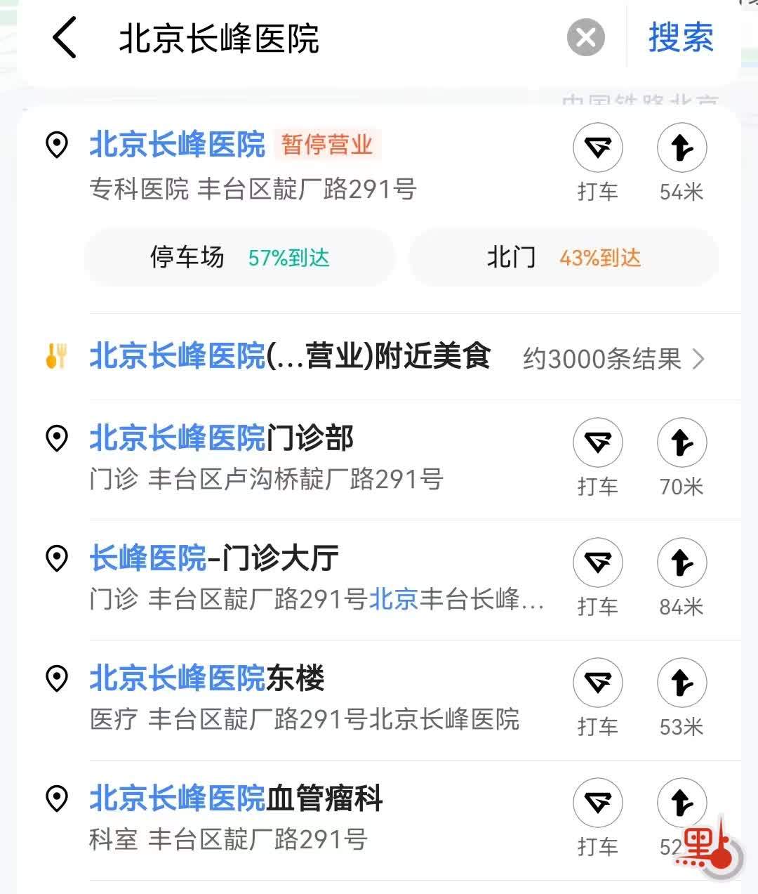 導航地圖顯示北京長峰醫院已經暫停營業。(手機截圖)