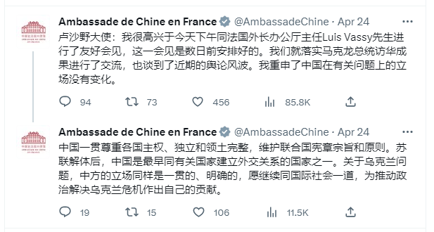 中國駐法國大使盧沙野日前受訪時稱,前蘇聯國家在國際法上「沒有有效主權」,觸發外交風波。法國外交部本周一(24日)召見中國大使盧沙野,盧沙野其後透過中國駐法國大使館Twitter表示,他在會見中重申中國在有關問題上的立場沒有變化。