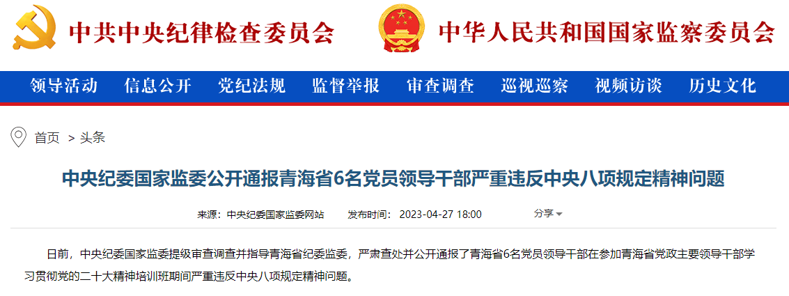中央紀委國家監委網站4月27日發布消息指,日前,中央紀委國家監委提級審查調查並指導青海省紀委監委,嚴肅查處並公開通報了青海省6名黨員領導幹部在參加青海省黨政主要領導幹部學習貫徹黨的二十大精神培訓班期間嚴重違反中央八項規定精神問題。