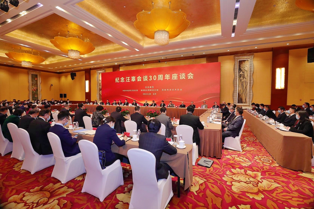 汪辜會談30周年座談會4月28日在北京舉行。30年前,在兩岸堅持體現一個中國原則的「九二共識」政治基礎上,海峽兩岸關係協會會長汪道涵與台灣海峽交流基金會董事長辜振甫在新加坡舉行會談,實現了兩岸雙方首次以受權民間團體名義舉行高層會談,標誌着兩岸關係發展邁出歷史性的重要一步。