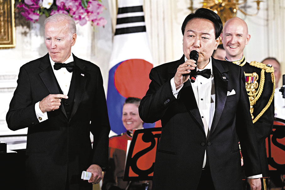 尹錫悅出訪美國前,美國外洩的機密文件顯示,美國一直在監控韓國政府,但尹錫悅卻迅即向美國「表忠」,表示這不會影響美韓兩國關係。尹錫悅在美國國會的發言全程用英語,在白宮晚宴上高唱《American Pie》,逗得美國總統拜登和在場人士眉開眼笑,都被指是為了討好美國。