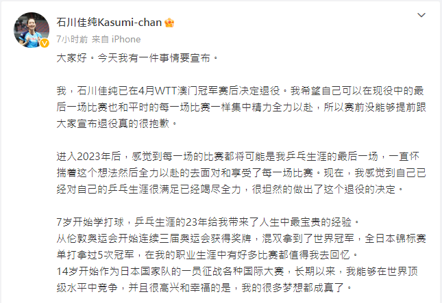石川佳純在文中寫道:「我已在4月WTT澳門冠軍賽後決定退役......進入2023年後,感覺每一場的比賽都可能是我乒乓生涯的最後一場,我一直懷揣着這個想法,全力以赴去面對和享受了每一場比賽......我7歲開始學打球,23年乒乓生涯給我帶來了人生中最寶貴的經驗。從倫敦奧運會開始連續三屆奧運會獲得獎牌,混雙拿到了世界冠軍,全日本錦標賽單打拿過5次冠軍,在我的職業生涯中,有很多比賽都值得我去回憶。」