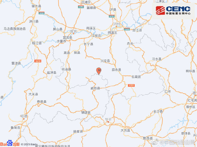 中國地震台網正式測定,13時04分在宜賓市興文縣(北緯28.10度,東經105.12度)發生4.5級地震,震源深度8千米;12時08分,宜賓市興文縣亦發生4.0級地震,震源深度10千米。