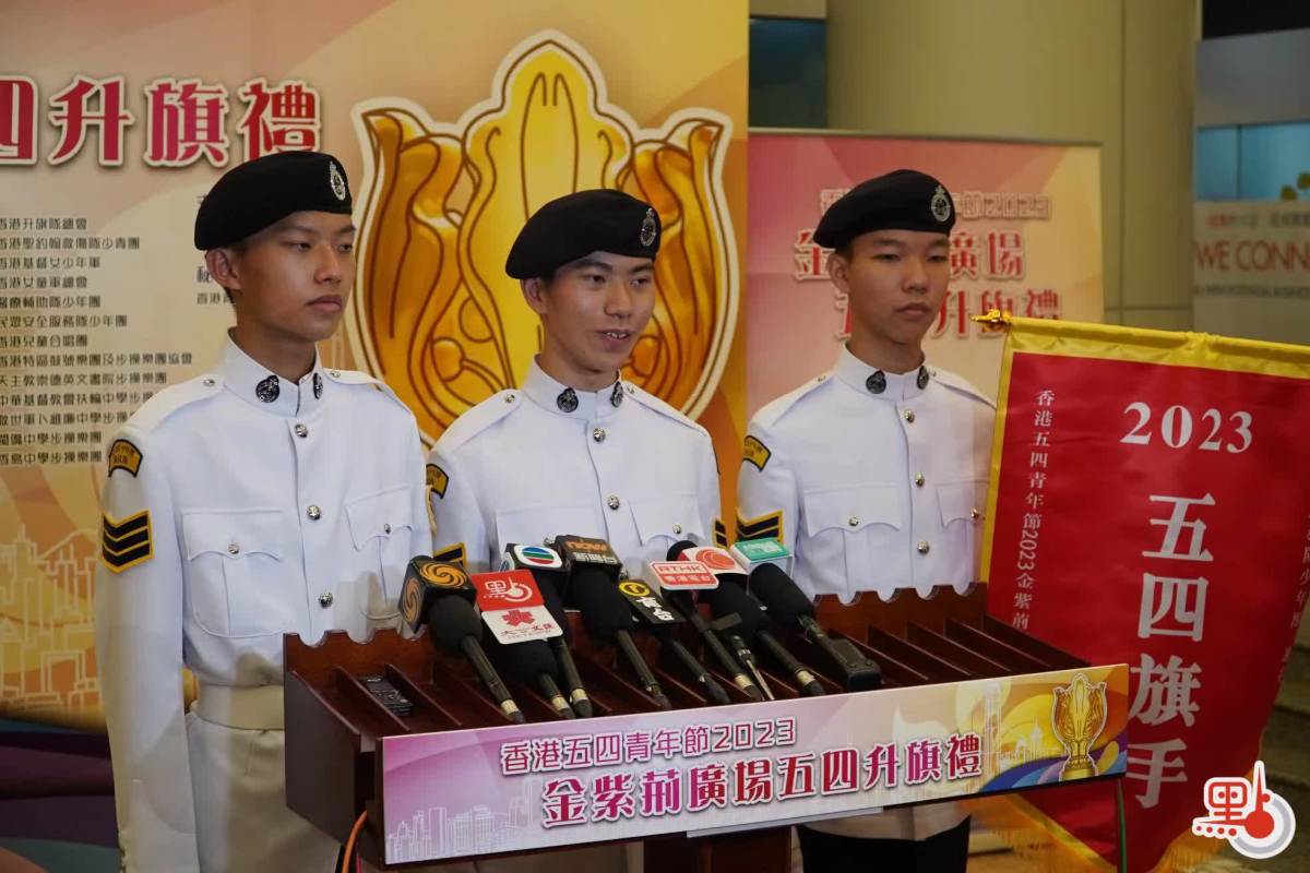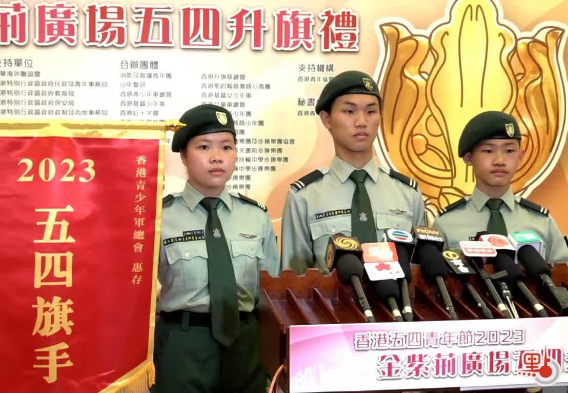 香港青少年軍總會隊員梁同學表示,今次有幸擔任五四升旗禮的國旗擎旗手,是至高無上的榮譽。他透露,總會自本年1月起,已為五四升旗禮作準備,例如,從9名旗手中挑選3名,與其他青年制服團隊競爭,選拔過程競爭激烈。