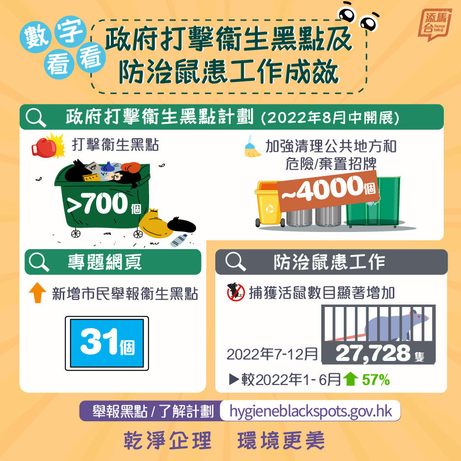 - 「政府打擊衞生黑點計劃」專題網頁過去3個月瀏覽總次數近13000次,並已將31個市民舉報地點納入新衞生黑點;