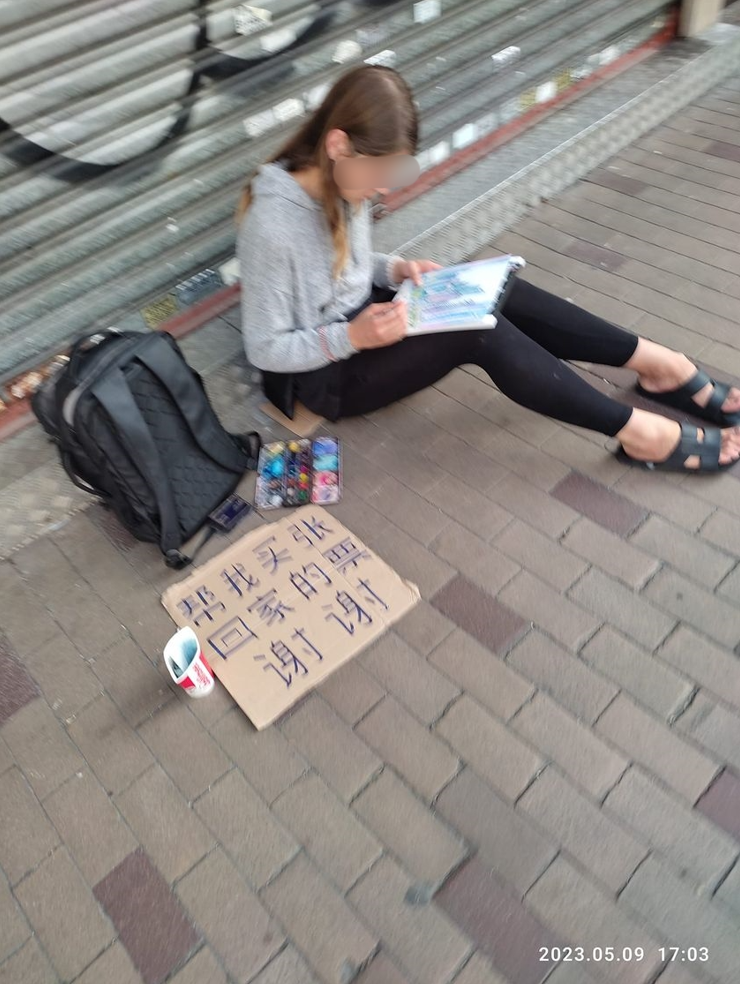 有網民前日(9日)下午在FB群組上載一張照片,拍攝到一名年輕外國女子坐在街邊地上,身邊放有一個黑色背囊。還有一張用簡體字寫上「幫我買張回家的票 謝謝」的紙牌,另有一個內有疑似紙幣的紙杯。上載照片的網民提到:「外國女人,講英文,叫人幫佢買張機票,是不是騙子??還有地上的字邊個幫佢寫???」引來熱烈討論。