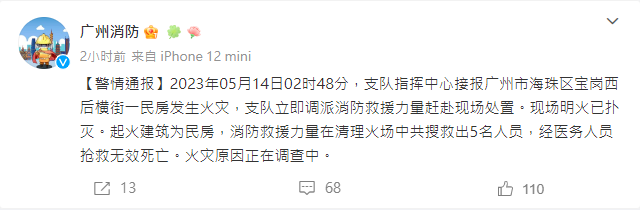 【點新聞報道】據廣州消防今日(14日)微博通報,2023年5月14日2時48分,支隊指揮中心接報廣州市海珠區寶崗西後橫街一民房發生火災,支隊立即調派消防救援力量趕赴現場處置。現場明火已撲滅。起火建築為民房,消防救援力量在清理火場中共搜救出5名人員,經醫務人員搶救無效死亡。火災原因正在調查中。