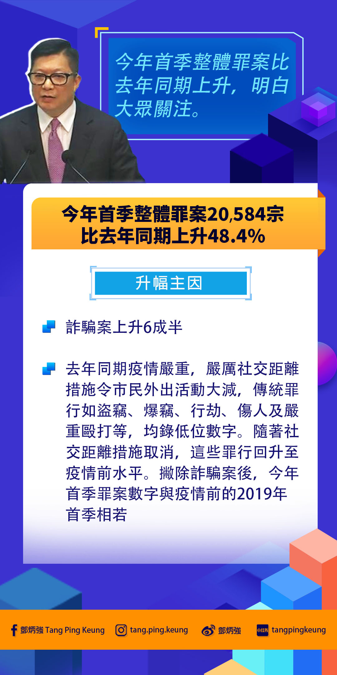 鄧炳強解畫,今年首季罪案數字顯著上升,主要原因是詐騙案大增,加上去年同期受第五波疫情影響,社交距離措施嚴厲,外出活動人數大減,令傳統罪案數字處於低位,以及警方着力抗疫,主動出擊調查的個案相對減少。