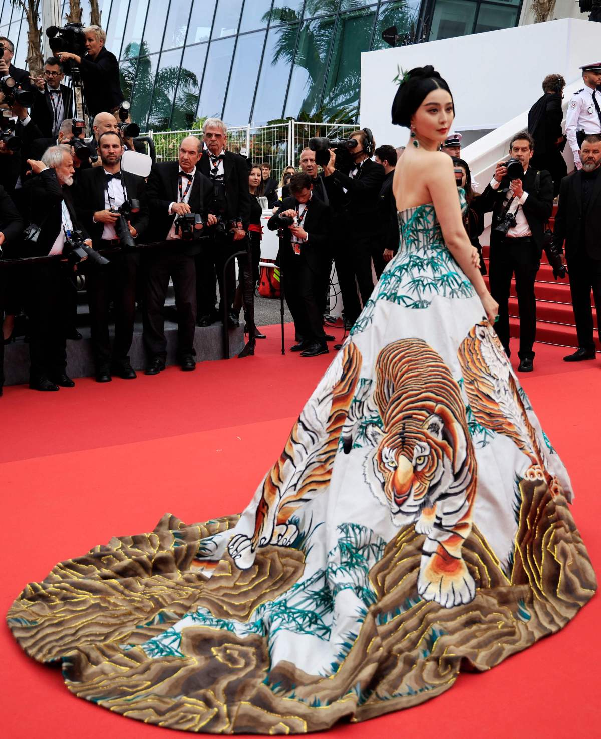 曾經以各類造型稱霸紅地氈的范冰冰驚喜亮相紅地氈,狀態大勇。41歲的范冰冰身穿一字膊低胸長裙,裙子則繡有老虎及竹葉的圖案,頗有猛虎出山的氣質,頭上佩戴一枝竹葉,相當「中國風」。設計師「Christopher Bu」更發文指:「這個衣服為你整整存了六年!再次看到還是感動!」