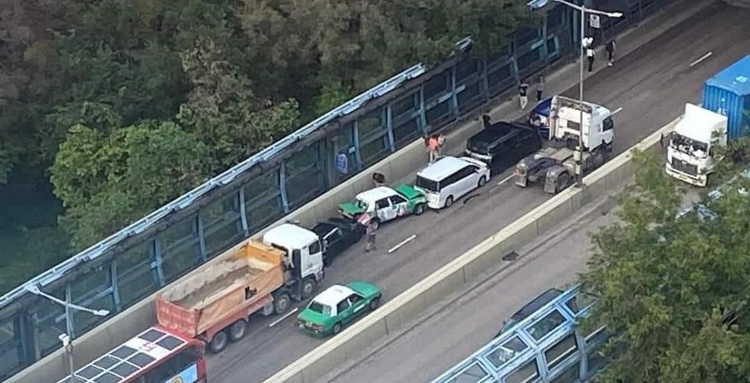 【點新聞報道】今日(17日)下午5時許,屯門皇珠路(往屯門公路方向)近安定邨位置發生6車相撞交通意外,涉及私家車、的士、重型貨車等。事件中5人受輕傷,送院治理。
