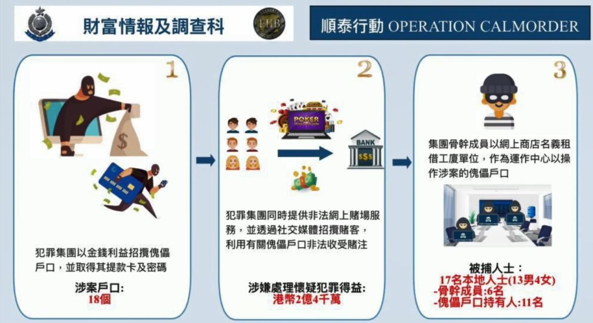 警方表示,早前透過情報收集和分析,發現一個活躍本港的犯罪集團設立海外的賭博網站,並以數百至數千元報酬招攬市民在虛擬銀行開設戶口,買入其提款卡、登入名稱和密碼。集團同時透過社交平台招攬賭客,聲稱提供網上麻雀、撲克和百家樂賭博。當賭客聯絡中介人後,會替其開設賭博戶口,然後提供早買入的傀儡戶口號碼,讓賭客存錢轉成分數進行博彩。