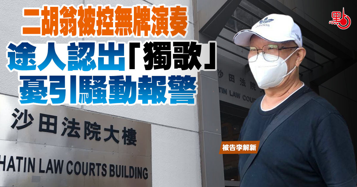 律政司高級檢控官林曉敏昨在庭上,讀出經修訂的承認事實,指被告李解新(69歲)拉二胡時,前方放置一個內有紙幣的箱子,有途人認出被告在拉奏「獨歌」,感到十分煩擾,擔心引起騷動,遂用手機拍下及報警,警方在巡邏及接到市民投訴指被告演奏後票控他。承認事實指,被告當時展示紙張有因街頭演奏「獨歌」被起訴字眼,列出包括屯門法院、九龍城法院、西九龍法院及沙田法院的聆訊時間及進度 :「反覆N次重審」;紙上亦寫有「無錢打官司請求援助」、「在此募捐」等字句。