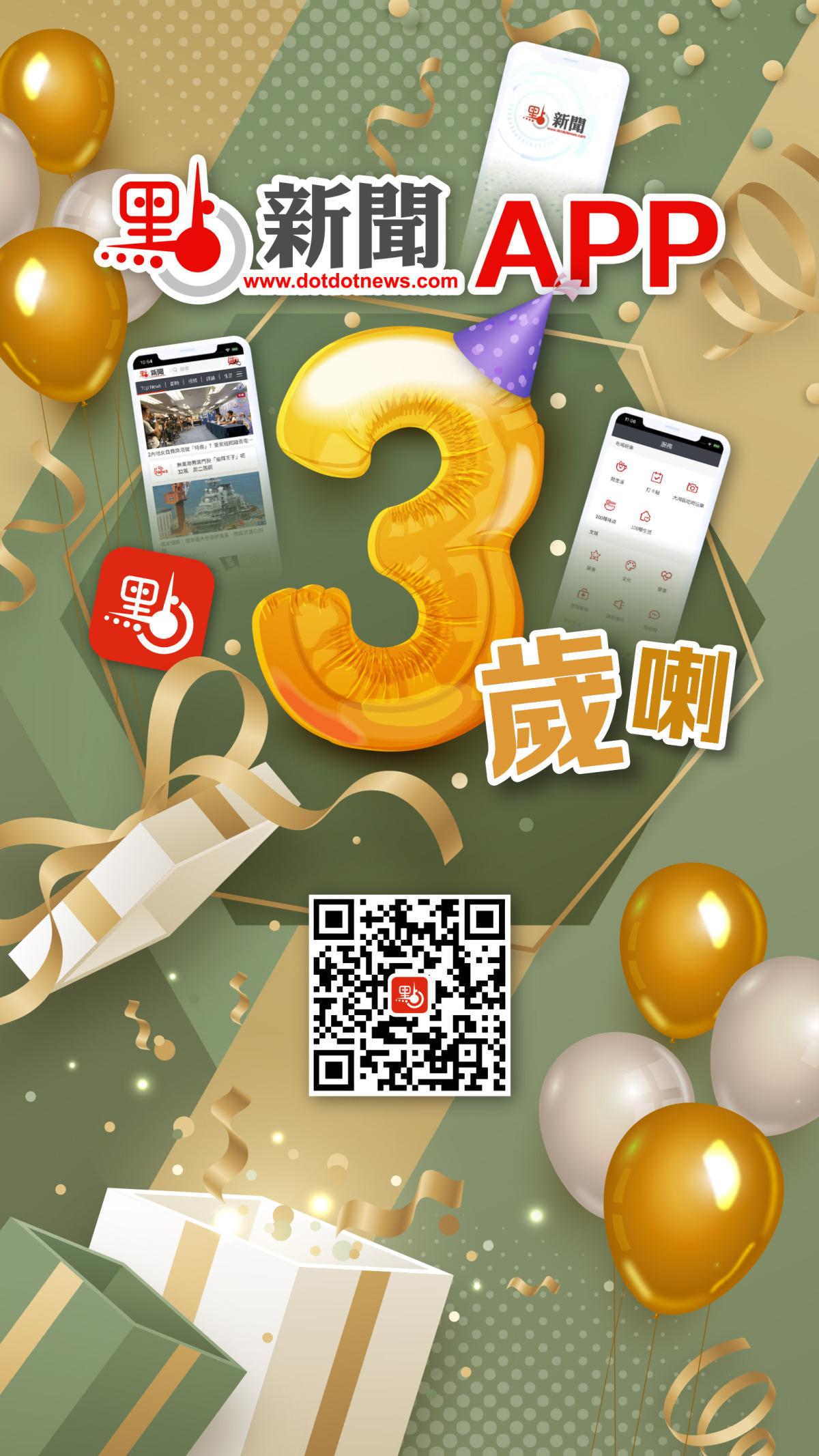 點新聞特意製作一組點新聞APP 3歲喇的海報,表達我們的喜悅之情。三年來,香港進入由亂到治走向由治及興新階段,點新聞一路與大家共同走過,風裏雨裏陽光裏,點新聞團隊與香港一起再出發,一點浩然氣,千里快哉風!
