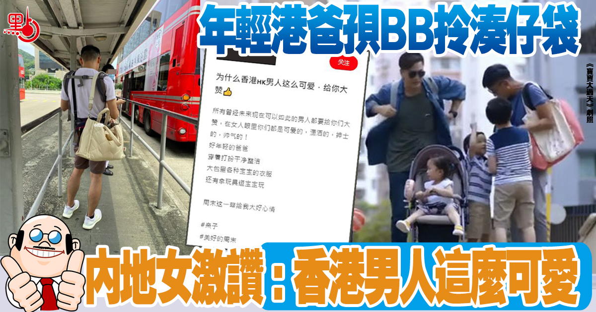 咁熟手!一定係平時成日湊仔嘅好爸爸!早前有內地女網民在小紅書發文分享,一名年輕港爸孭着年幼寶寶外出,還揹一個「媽媽袋」。內地女非常欣賞這位爸爸的舉動,大讚「香港男人這麼可愛」。帖文引來網民熱議,「完美老公」、「這樣才是好男人」。