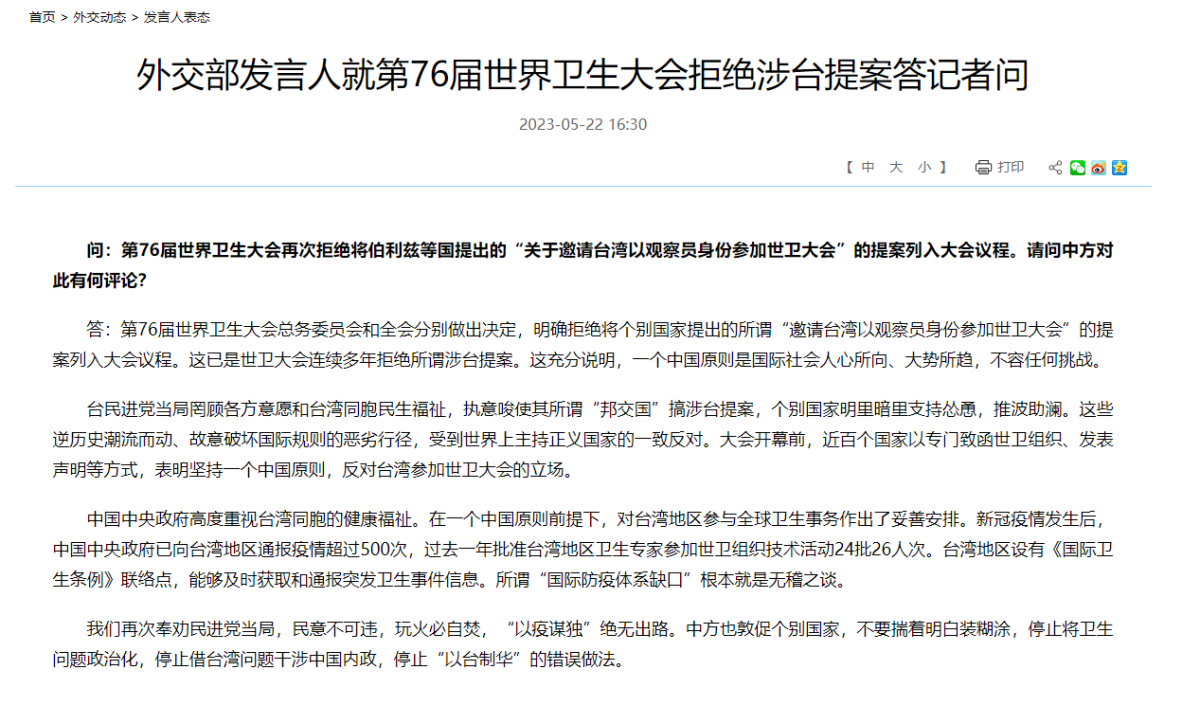 【點新聞報道】第76屆世界衞生大會當地時間今日(22日)作出決定,明確拒絕將個別國家提出的「邀請台灣以觀察員身份參加世衞大會」的提案納入大會議程。對此,外交部發言人表示,這已是世衞大會連續多年拒絕所謂涉台提案,充分說明一個中國原則是國際社會人心所向、大勢所趨,不容任何挑戰。