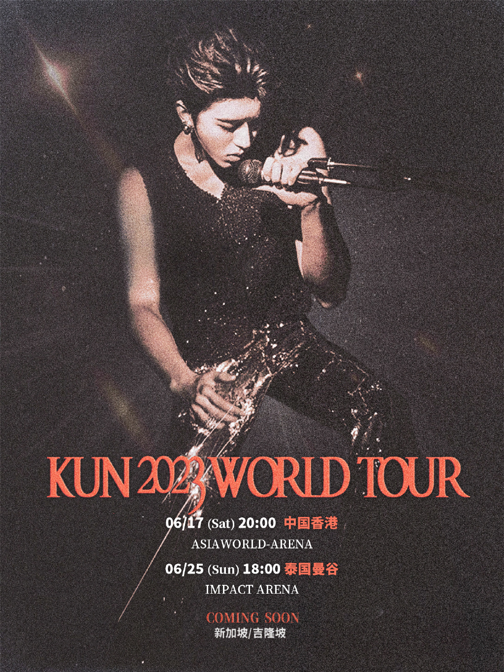 蔡徐坤早前在社交平台表示,即將開啟全新世界巡演《KUN 2023 WORLD TOUR》,啟動海報上顯示了中國香港、中國澳門、曼谷、新加坡以及吉隆坡五個城市及地區。