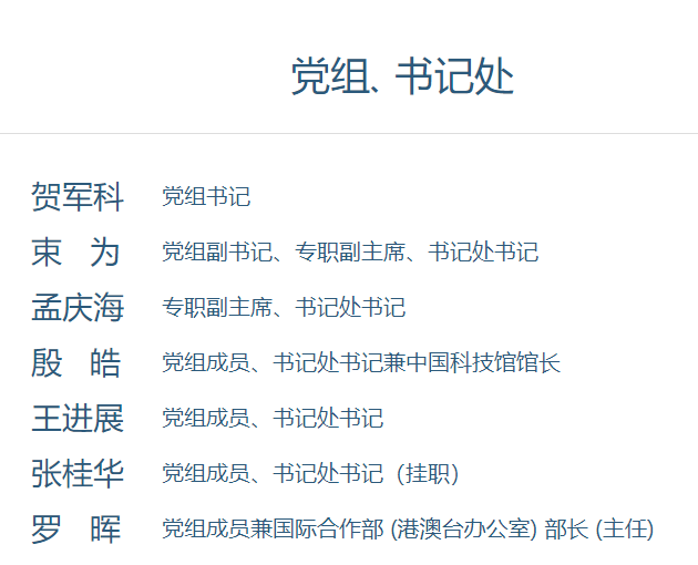 據中國科學技術協會官網「科協領導」一欄最新信息顯示,原任團中央書記處第一書記賀軍科,已任中國科協黨組書記。賀軍科出生於1969年2月,2005年任共青團中央書記處書記,2013年6月任共青團中央書記處常務書記,2013年9月當選全國青聯主席,2018年6月當選團中央書記處第一書記,至此番履新。賀軍科是十九屆中央候補委員、二十屆中央委員。