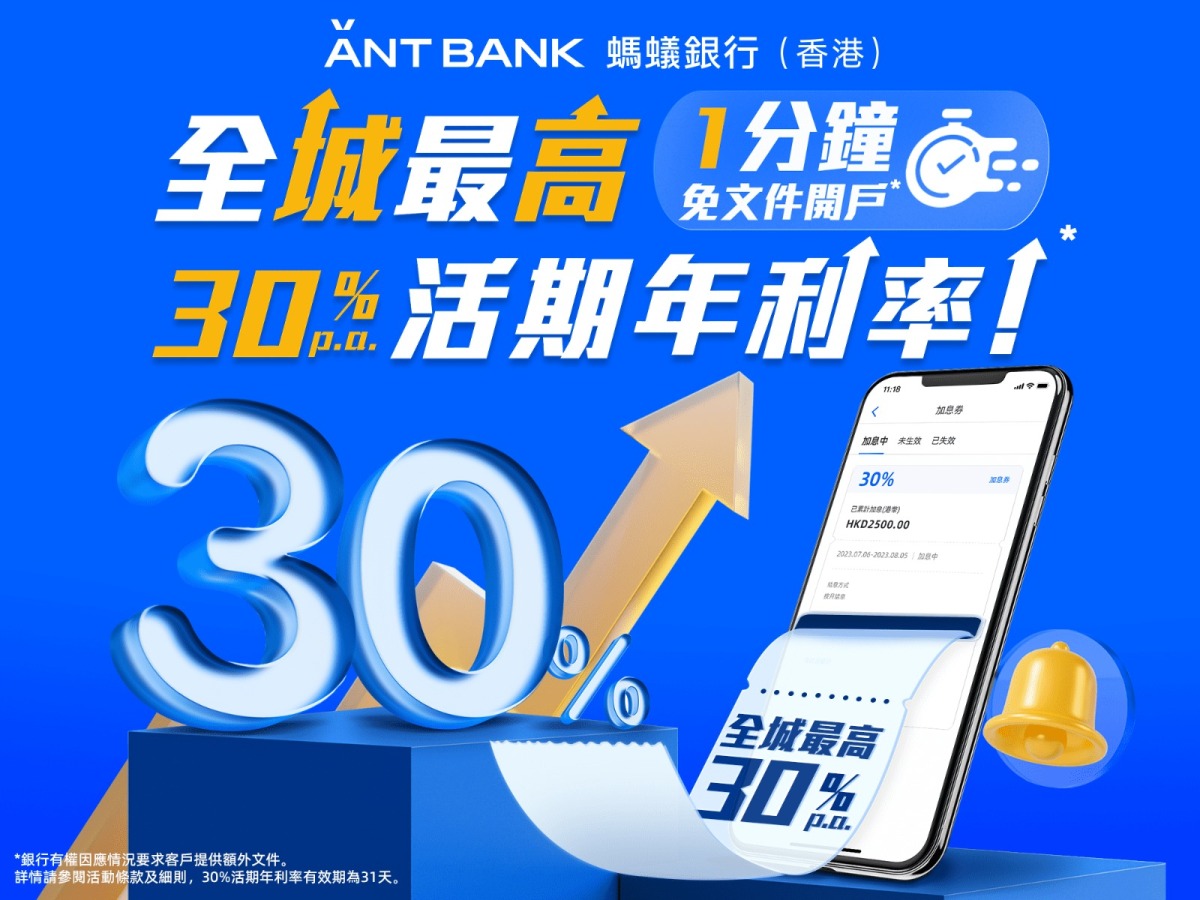 另外,即日起至6月30日,用戶成功開通並接受Ant Bank PayLater額度,且在月內用Ant Bank PayLater完成至少1筆交易,即可在6月10、20及30日透過AlipayHK進入螞蟻銀行的指定活動頁面搶首港幣10萬元30%年利率獎賞優惠券,每人最多可搶1張。而其他合資格新用戶亦可享首港幣10萬元高達7%存款利率獎賞,日日可賺息。