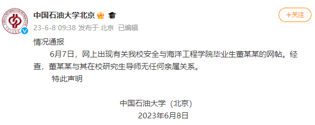 此外,中國石油大學(北京)今日發布情況通報指,6月7日,網上出現有關我校安全與海洋工程學院畢業生董某某的網帖。經查,董某某與其在校研究生導師無任何親屬關係。