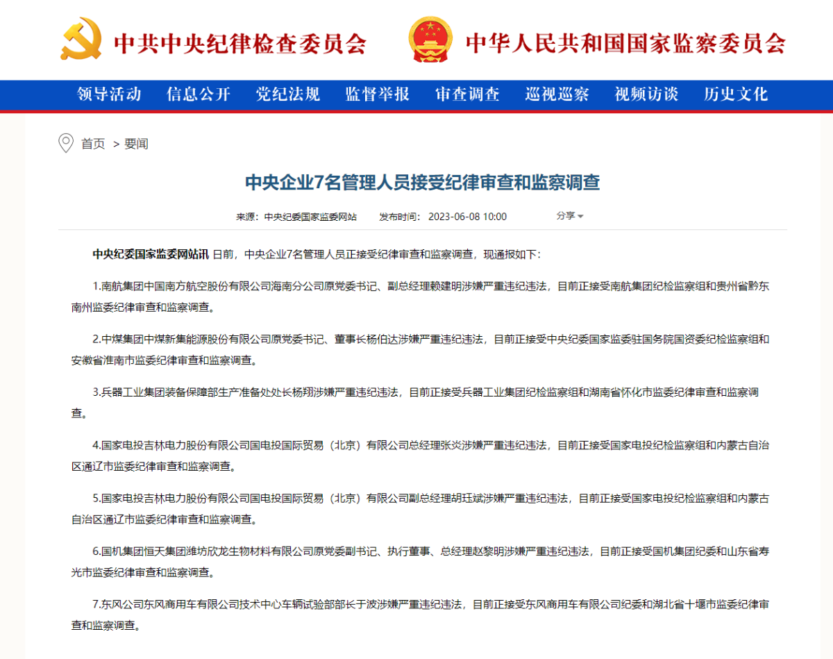 【點新聞報道】中央紀委國家監委網站今日(8日)發布消息指,日前,中央企業7名管理人員正接受紀律審查和監察調查,現通報如下: