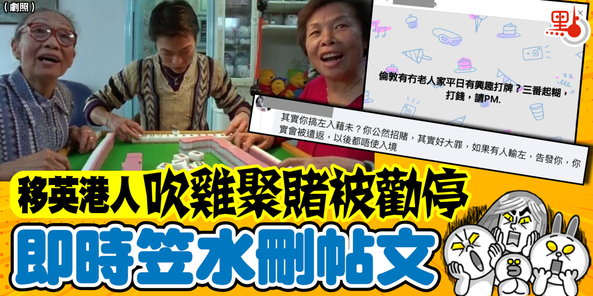 該名移英港人早前在社交平台的移民群組發英雄帖,「偷敦有冇老人家平日有興趣打牌?三番起糊,打錢,請PM」咁話。麻雀腳就唔知搵唔到,但有網民質疑樓主搞賭檔,亦有人留言話:「你公然招賭,其實好大罪,如果有人輸咗,告發你,你實會被遣返,以後都唔使入境」。隨後,事主已刪去有關帖文。