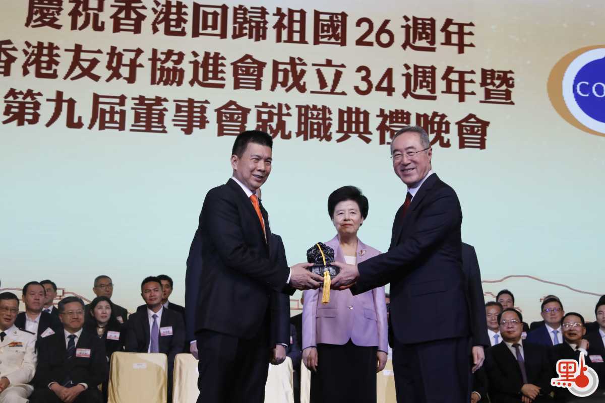 【點新聞報道】「慶祝香港回歸祖國26周年、香港友好協進會成立34周年暨第九屆董事會就職禮晚會」今晚(8日)假會展中心舉行,全國政協副主席咸輝、行政長官李家超、中聯辦主任鄭雁雄等出席。香港友好協進會第八屆董事會會長唐英年,與第九屆董事會會長譚錦球交接會長印鑒。