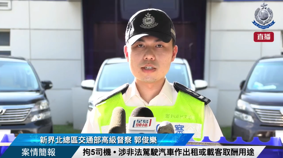【點新聞報道】警方一連兩日在新界北區內打擊俗稱「白牌車」的非法駕駛汽車作出租或載客取酬的行為,以「非法駕駛汽車作出租或載客取酬用途」及「使用汽車時沒有第三者保險」拘捕5名本地司機,並扣查所有涉案車輛作檢驗。