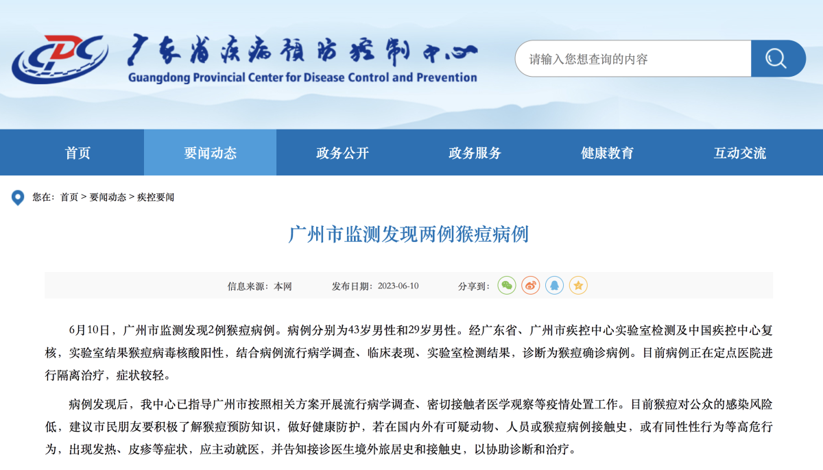 據廣東省疾病預防控制中心網站,6月10日,廣州市監測發現2例猴痘病例。病例分別為43歲男性和29歲男性。經廣東省、廣州市疾控中心實驗室檢測及中國疾控中心覆核,實驗室結果猴痘病毒核酸陽性,結合病例流行病學調查、臨床表現、實驗室檢測結果,診斷為猴痘確診病例。目前病例正在定點醫院進行隔離治療,症狀較輕。