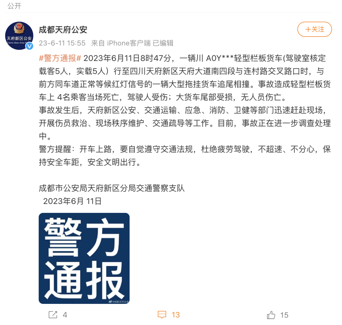 據微博賬號「成都天府公安」,成都市公安局天府新區分局就一起追尾事故發布警方通報。通報指,2023年6月11日8時47分,一輛川A0Y***輕型欄板貨車(駕駛室核定載客5人,實載5人)行至四川天府新區天府大道南四段與連村路交叉路口時,與前方同車道正常等候紅燈信號的一輛大型拖掛貨車追尾相撞。事故造成輕型欄板貨車上4名乘客當場死亡,駕駛人受傷;大貨車尾部受損,無人員傷亡。
