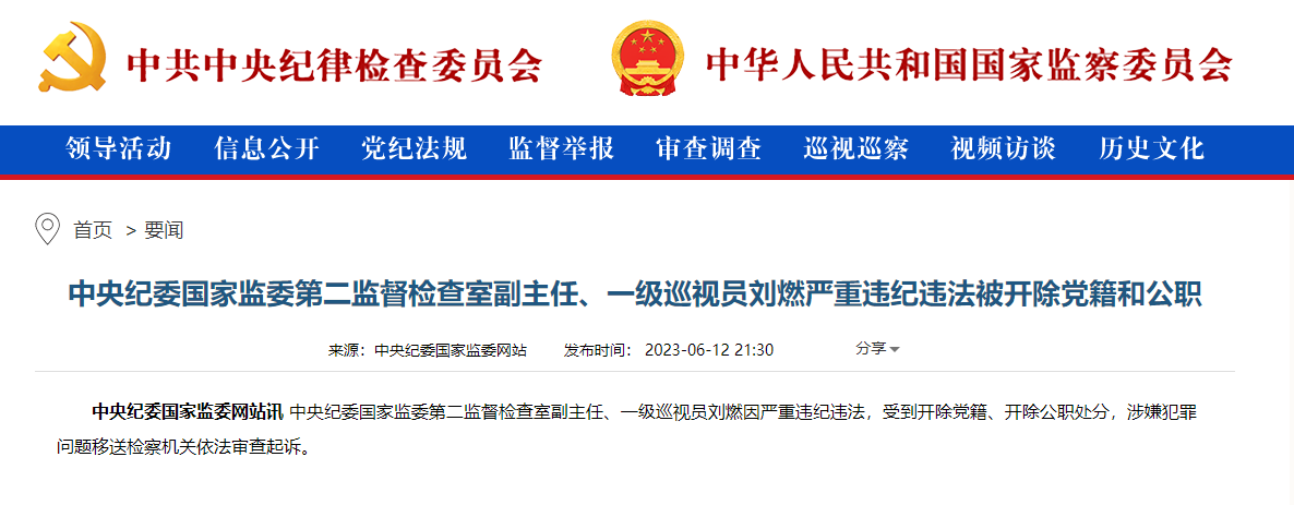 【點新聞報道】據中央紀委國家監委網站6月12日消息,中央紀委國家監委第二監督檢查室副主任、一級巡視員劉燃因嚴重違紀違法,受到開除黨籍、開除公職處分,涉嫌犯罪問題移送檢察機關依法審查起訴。
