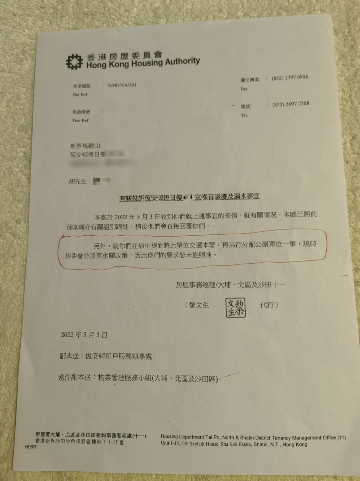 至於噪音問題。房屋署表示,自2018年起多次接到事主報稱上層單位發出噪音的反映,除即時轉介法團管理公司跟進外,房屋署亦主動作出調查,可是至今未有發現任何顯示上層租戶發出噪音的證據。按現行「屋邨管理扣分制」,租戶如被證實於單位內造成噪音滋擾,會被扣分。房屋署將繼續與法團管理公司合作,跟進事主的個案。警務處亦指,警方於2022年11月接獲投訴,警員接報到場卻未有相關發現,案件列作「噪音投訴」。