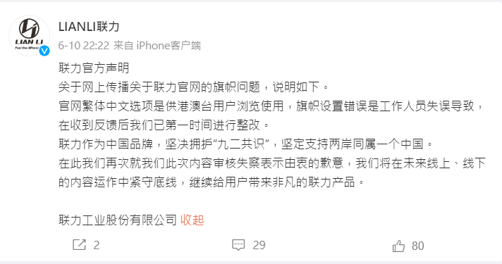 關於網上傳播關於聯力官網的旗幟問題,聯力官方於微博和Bilibili(B站)表示,官網繁體中文選項是供港澳台用戶瀏覽使用,旗幟設置錯誤是工作人員失誤導致,在收到反饋後已第一時間進行整改。聯力作為中國品牌,堅決擁護「九二共識」,堅定支持兩岸同屬一個中國。聯力官方就此次內容審核失察表示由衷的歉意,並表示將在未來線上、線下的內容運作中緊守底線。