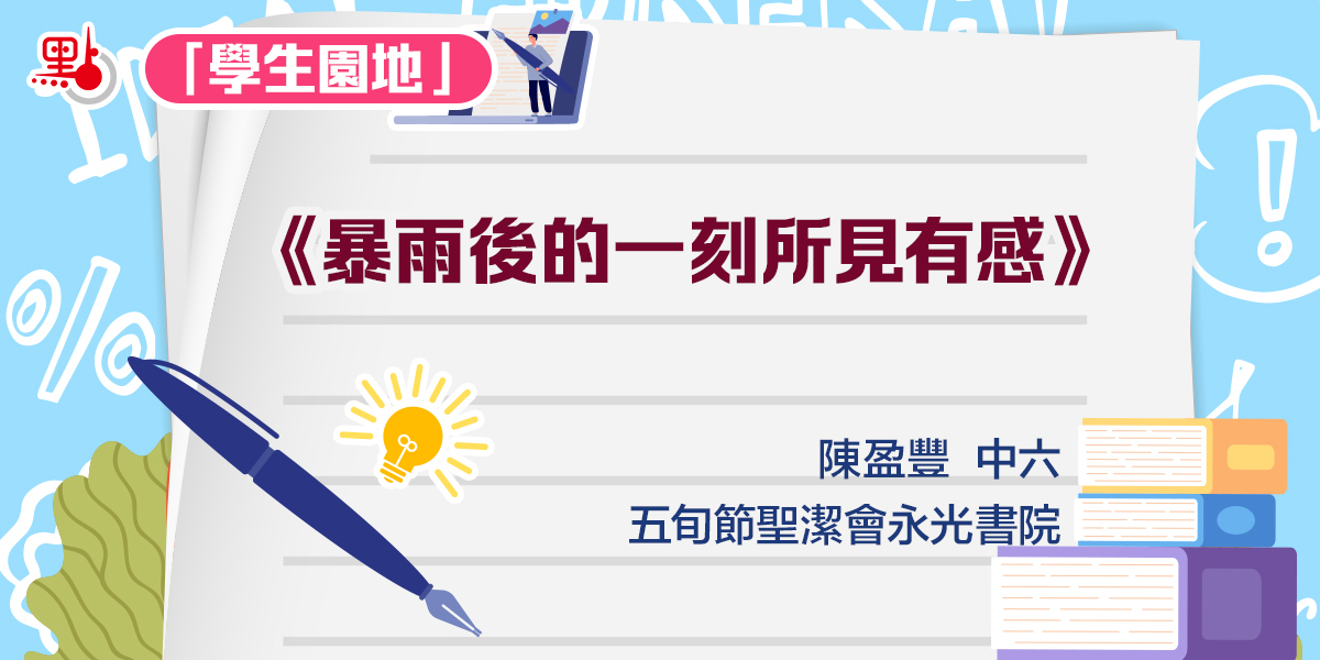 還記得小時候的我最喜歡暴雨了,有次從書中看到暴雨後的天空會出現彩虹,每逢大雨時總望向窗外等待暴雨的止息,能看到那色彩繽紛的彩虹不是每個人嚮往的事嗎?正如流星般,正因其罕有才成為每個人的心心念念之事,讓人許下能一窺自然之美的心願,而且每次暴雨後,地上總會出現不同的形狀和深淺的水窪,有的是不規則形狀,有的是心形,有的是圓形,有的淺得無法產生水花,有的能踏出水花而發出聲音,多麼千變萬化啊。那時與小夥伴穿着雨衣,水鞋踏在水窪上不正是代表稚氣和純真嗎?如今的我只看到暴雨的禍害,卻忽視暴雨為城市帶來的清新啊!正因暴雨,本來熙來攘往的城市得以安靜下來,正因暴雨,喘不過氣來的城市人才能有休息的時間,在家中看一直以來想追的劇,填補失去的睡眠時間,正因暴雨,讓人把久抑的情緒如暴雨的嚎啕傾瀉出來,正如現在的我,也因暴雨而牽動千思萬緒。