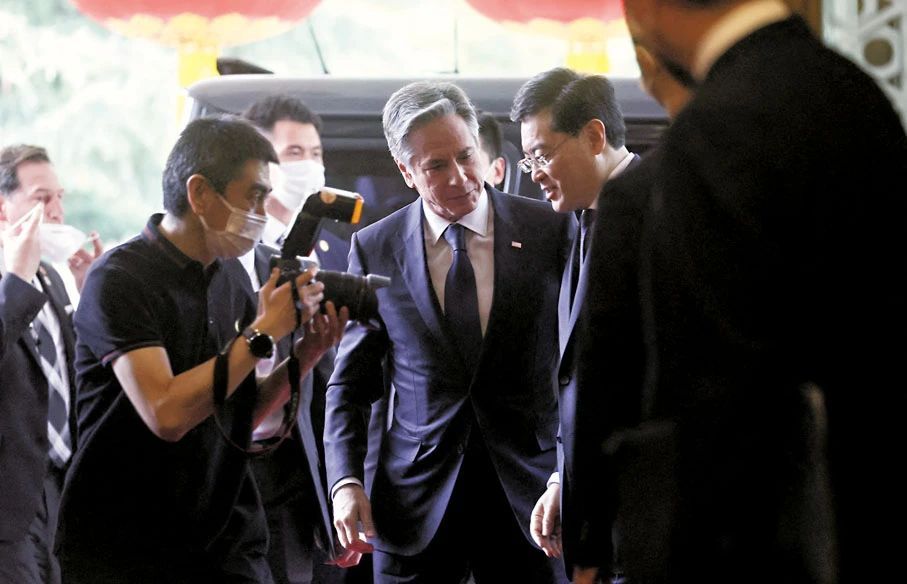 新加坡《聯合早報》指出,布林肯抵達釣魚台國賓館後,與迎接他的秦剛交談。根據視頻,隱約可以聽到彼此見面時,秦剛輕鬆地與布林肯寒暄。秦剛先用英語跟布林肯說「很高興能在北京再次見到你,旅途還愉快嗎?」布林肯回答說「很好」。布林肯接着說了一些話後,秦剛便說「我們會停下來拍照」。之後兩人在中美國旗前合照,並在結束後開始會談。