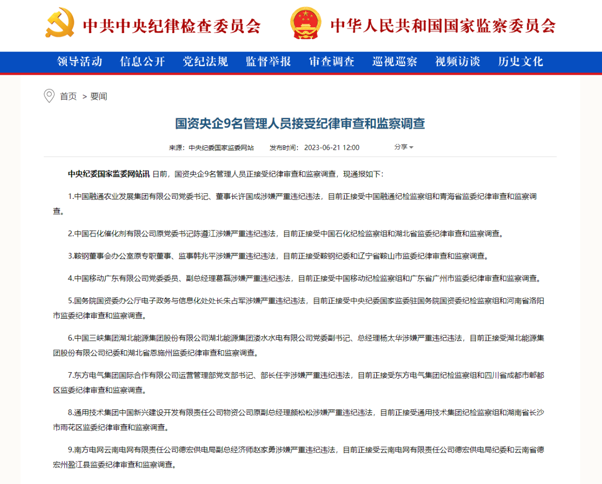 【點新聞報道】中央紀委國家監委網站今日(21日)公布,日前,國資央企9名管理人員正接受紀律審查和監察調查,現通報如下:
