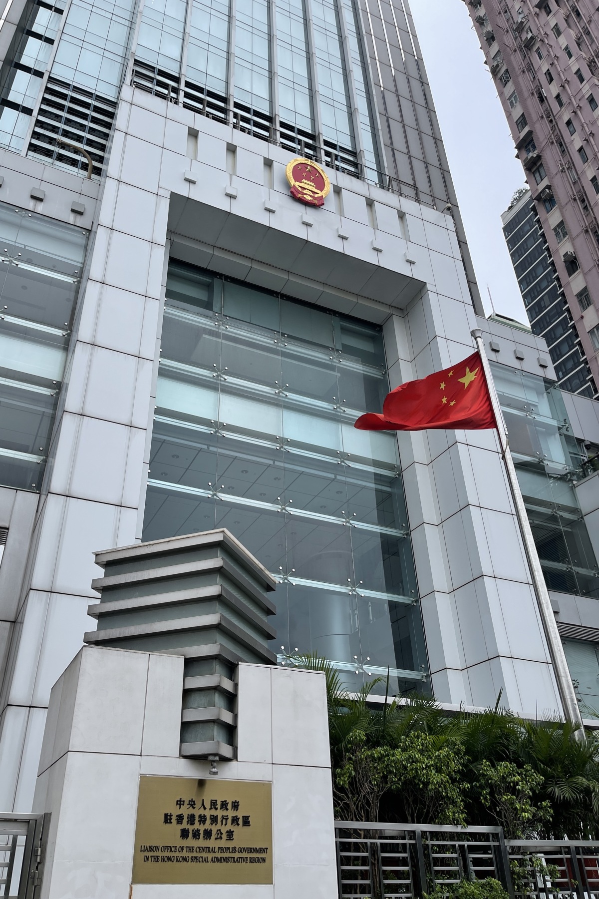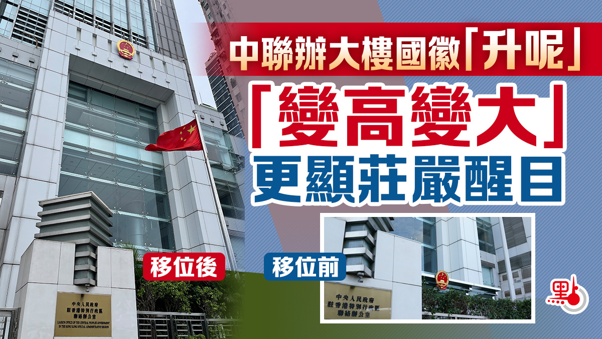 資料相片可見,中聯辦大樓外的國徽,過往曾懸掛於正門上方的玻璃棚處。從外面看,有時容易被大門前的綠化帶遮擋。而經過調整後,國徽被上移至外牆高處正中間,尺寸亦明顯增大,非常顯眼,也更加威嚴莊重。