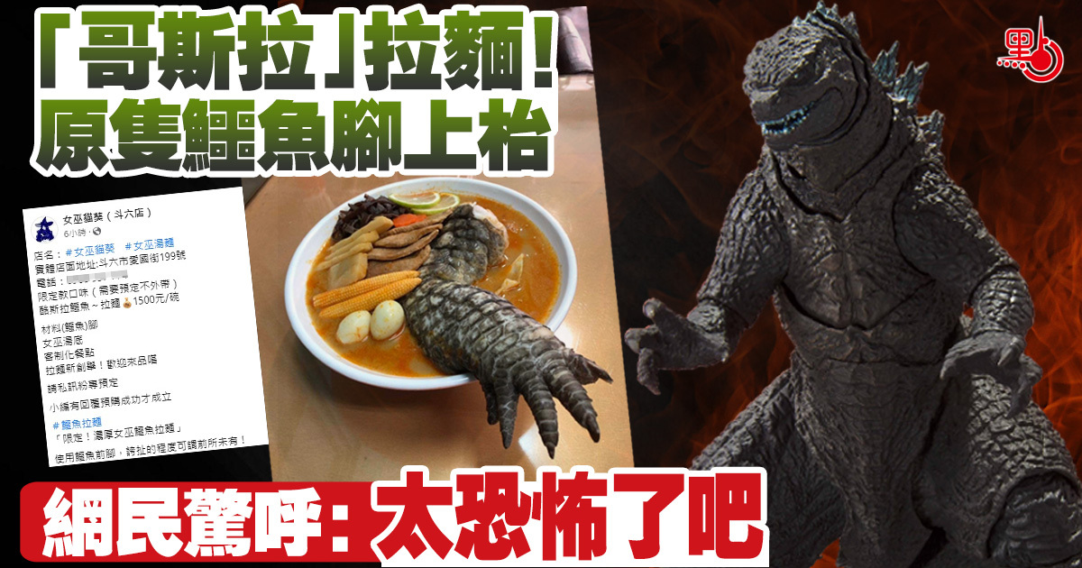 雲林斗店一家拉麵店在fb專頁「女巫貓葵(斗六店)」發文,推出一碗1500台幣的「哥斯拉鱷魚~拉麵」,自稱「使用鱷魚前腳,誇扯的程度可謂前所未有!」,指是限定款口味,需要預定、不提供外帶。從上載的相片所見,一整隻鱷魚腳感覺要從碗裏爬出來,5根腳趾分明,再次衝擊視覺!