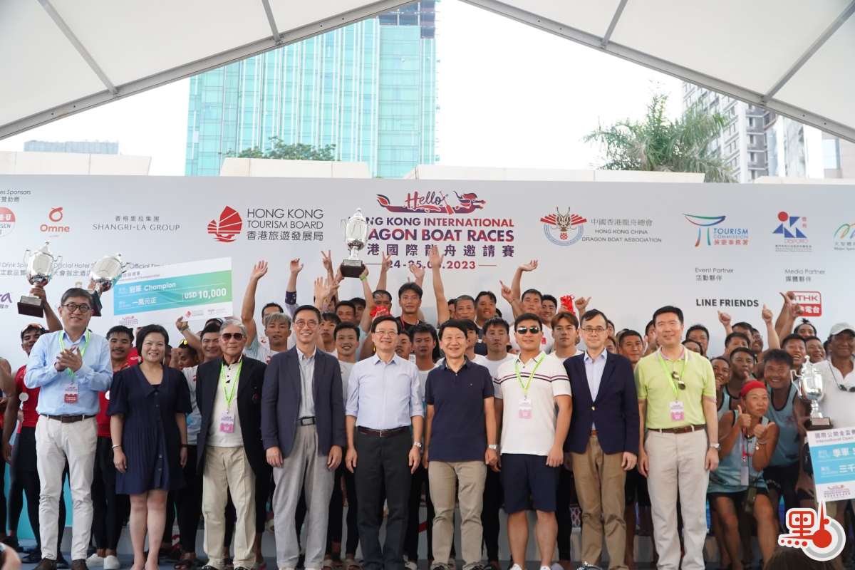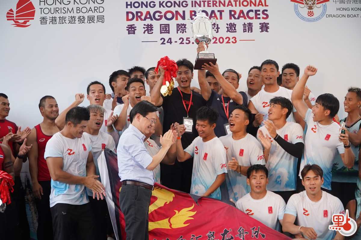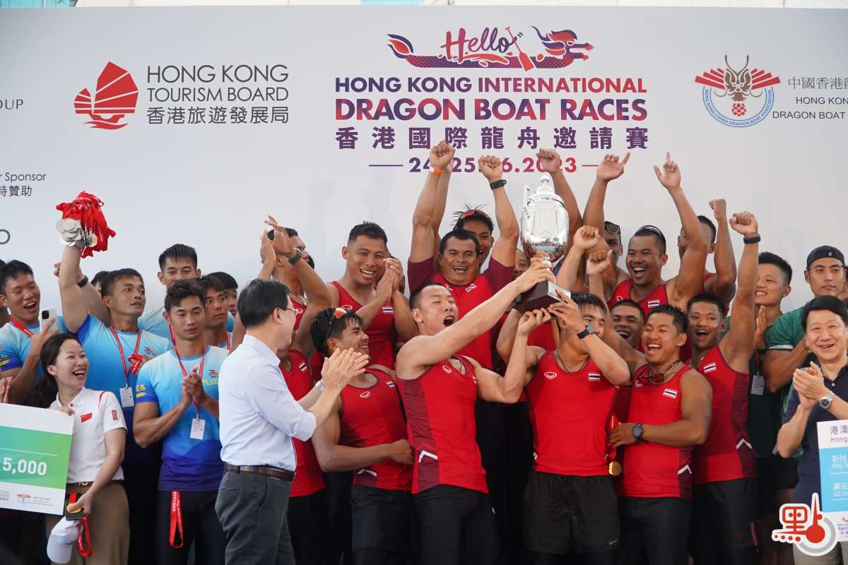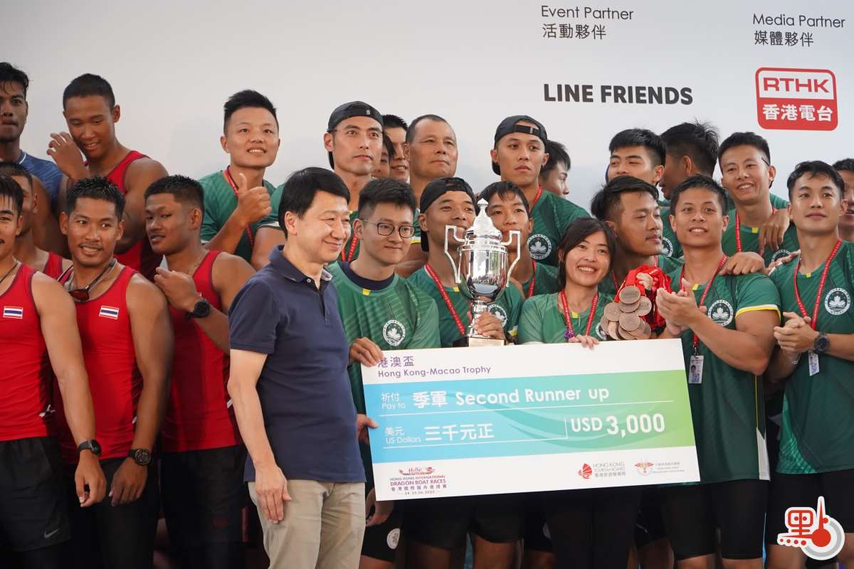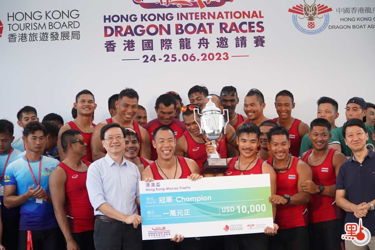 另外,今年的賽事首度與澳門特區攜手舉辦「港澳盃」,6支強勁的隊伍來自中國內地、泰國、菲律賓、澳洲以及香港特區及澳門特區,於6月22日及24日分別出戰「澳門國際龍舟賽」及「香港國際龍舟邀請賽」相關賽事,並於今日舉行的「港澳盃」決賽競逐冠軍。香港特區行政長官李家超、中國澳門龍舟總會理事長兼澳門體育委員會委員黃家豪、香港旅發局主席彭耀佳出席頒獎禮,為「港澳盃」得獎者頒發獎牌、獎杯及獎金。其中,泰國代表隊奪得冠軍,珠海九江雙蒸龍舟隊和中國澳門代表隊則分別奪得亞軍和季軍。