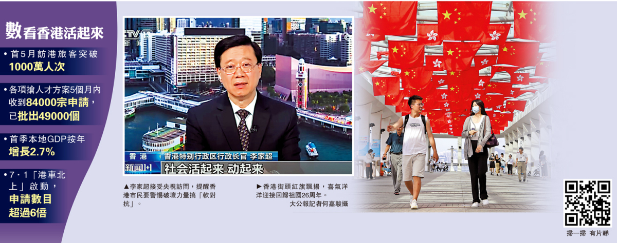 「在通關以後,今年前5月訪港旅客已經突破1000萬人次,消費方面呈現出活躍狀態。餐館、旅遊景點人潮湧湧,非常熱鬧。」李家超接受央視訪問時說,香港最近情況不錯,整個社會活起來,動起來了,老百姓更開心,對香港也更有信心!7月1日香港特區成立26周年,當日會有很多不同的慶祝活動,以及各類優惠活動,多項交通工具及娛樂文化活動亦免費。