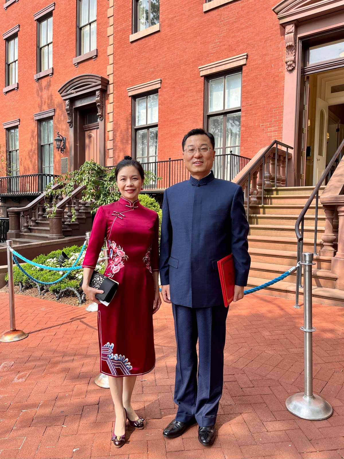 謝鋒還在其推特上發出四張圖片,其中兩張是在白宮和拜登合影,另兩張是他和夫人王丹一起走在白宮附近的街道上。謝鋒身穿中山裝,而夫人王丹一身大紅旗袍,非常顯眼。