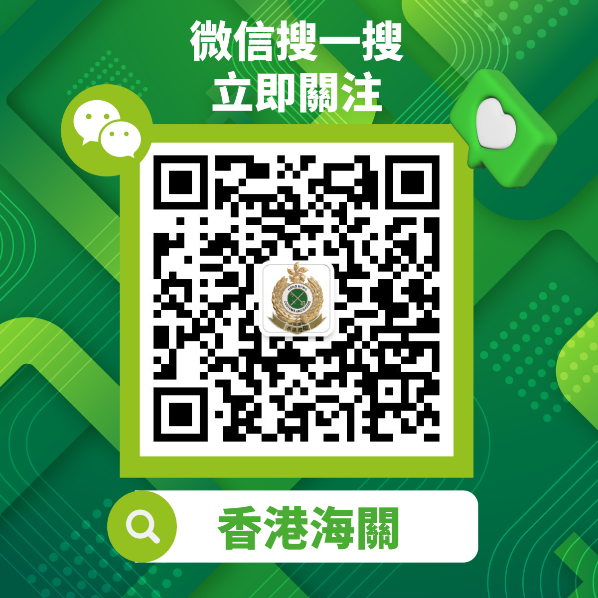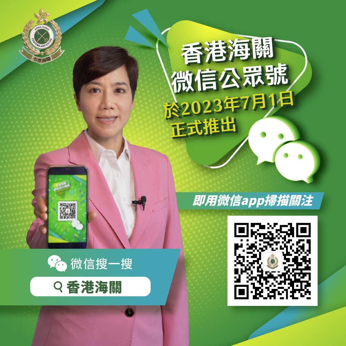 繼開設YouTube頻道、Facebook專頁、Instagram賬戶及抖音官方賬號後,海關開設微信官方賬號,作為第五個社交媒體官方平台,進一步加強海關與公眾的溝通和聯繫。海關會利用微信官方賬號發布部門多元化的工作和最新資訊,接觸更多香港及內地民眾,推廣海關專業形象,並讓公眾掌握更多有用的海關資訊。